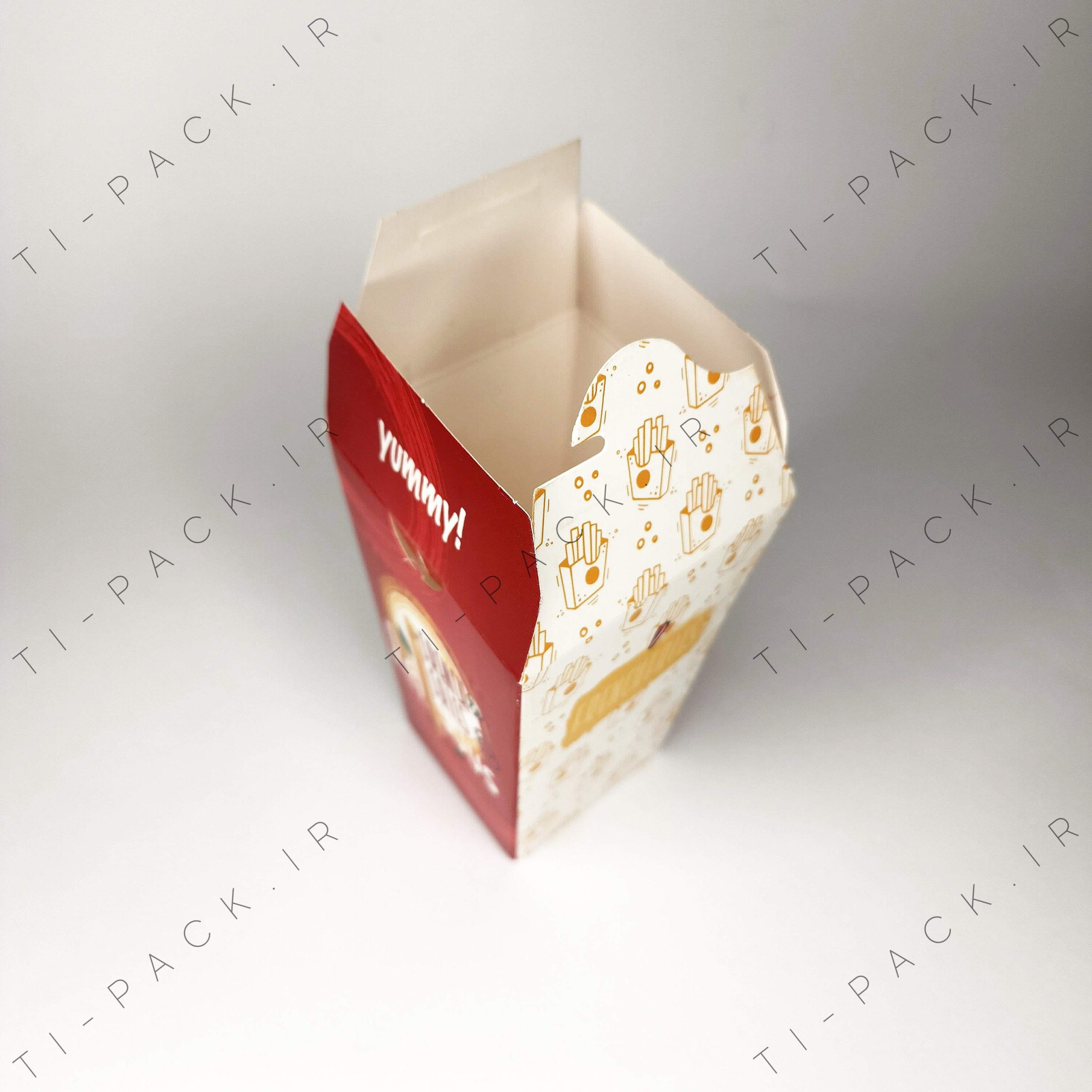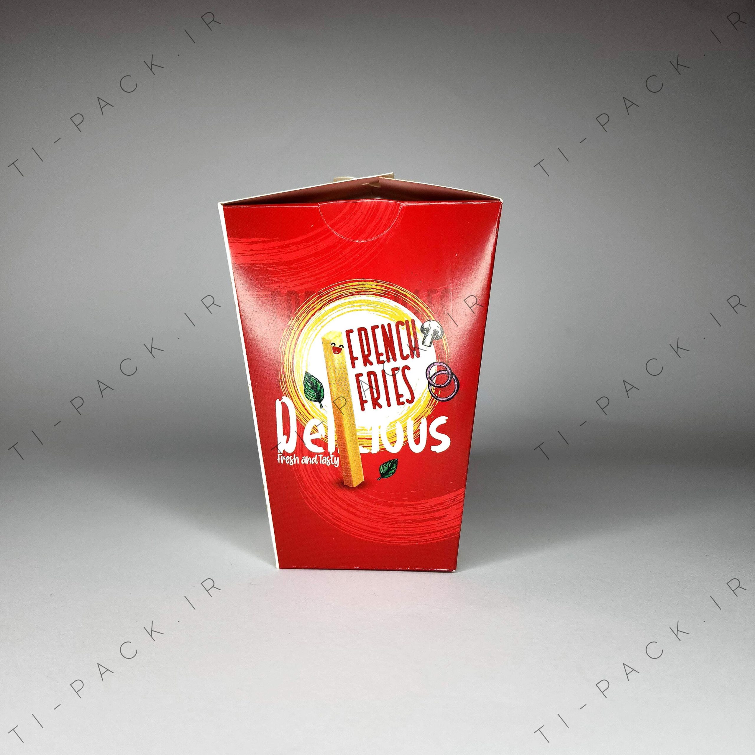 این جعبه با طراحی مخروطی‌شکل، فضای ایده‌آلی برای قرارگیری سیب‌زمینی دارد و باعث می‌شود سیب‌زمینی‌ها بهتر در جعبه بنشینند، کمتر افتاده و بیشتر قابل مشاهده باشند. همین موضوع باعث افزایش جذابیت بصری غذا، مخصوصاً در بسته‌بندی بیرون‌بر و سفارش‌های آنلاین می‌شود.